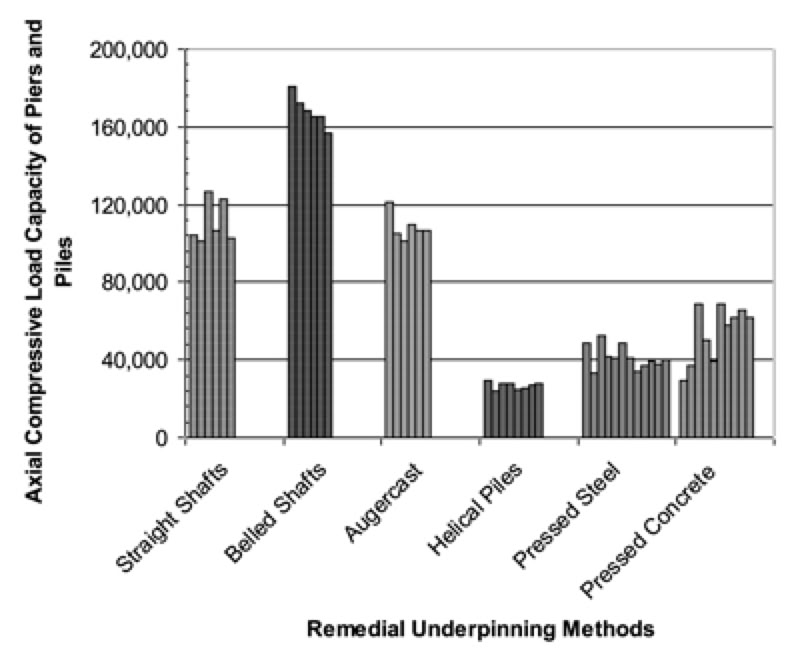 Dr. Witherspoon's doctoral research was the first of its kind to test axial compressive capacity (capacity to support a structure) for many of the foundation repair techniques that are being utilized today. The bar chart displayed above shows side by side capacities for each of the different methods, which in most cases provides a different picture of performance than is advertised by the foundation repair contractors. Dr. Witherspoon has been in the foundation repair business (Witherspoon founded S & W Foundation Contractors and designed their limited access and soil stabilization equipment) for over 22 years in combination with a personal evaluation of over 18,000 houses or building during a 40 plus year career has provided a unique perspective of remedial foundation repair effectiveness. Dr Witherspoon's comprehensive evaluation of foundation performance, provides a deep analysis of cause and effect for piering and piling techniques. "Expectations of Underpinning", which is a National standard for the Foundation Repair Association, provides for the customer a realistic view of pier and pile performance and expected outcomes of remedial underpinning.